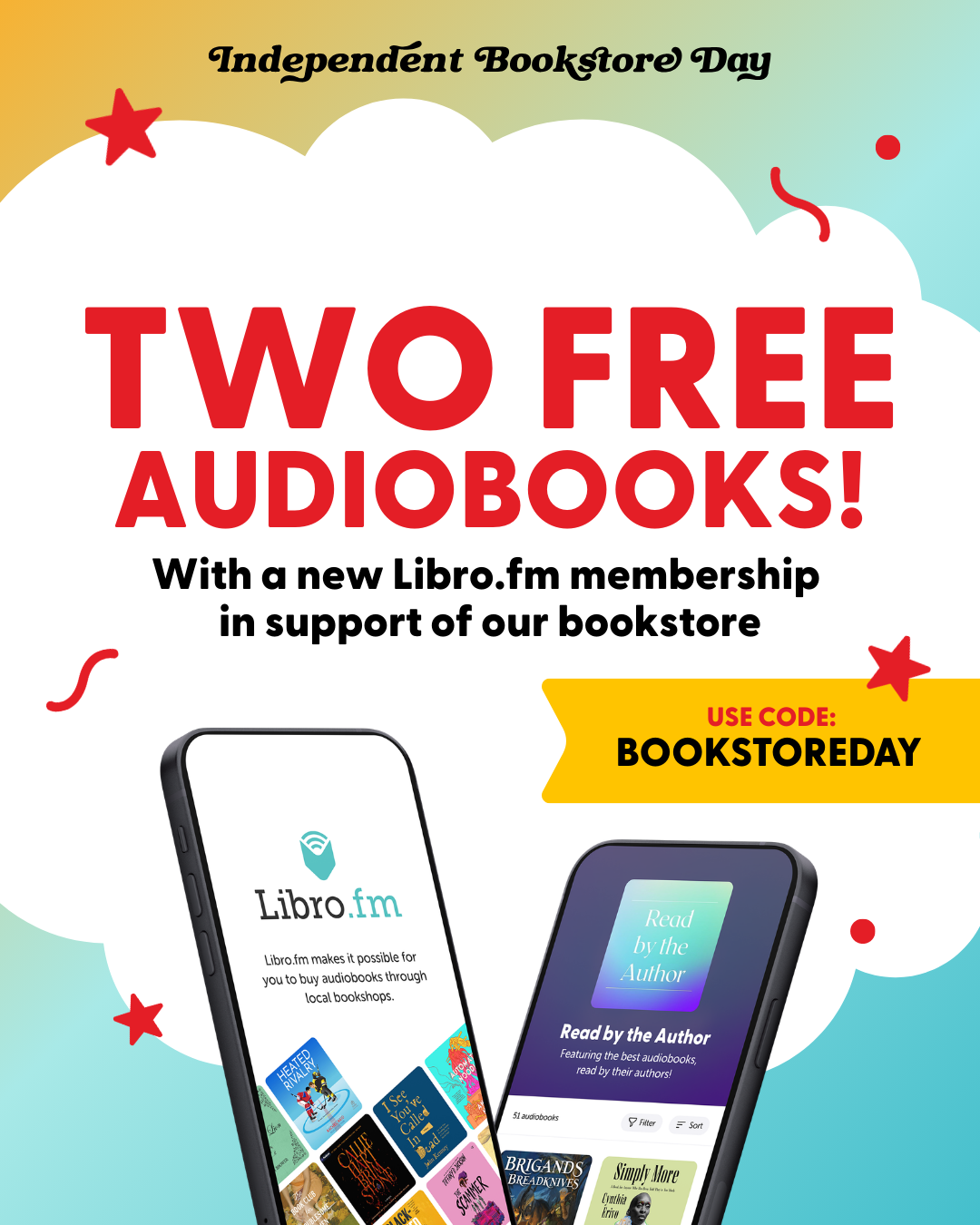 Help support your favorite bookshop!For Indie Bookstore Day, Shop Us on Libro.Fm! Use the code BOOKSTOREDAY and you’ll get two audiobook credits that can be used on bestsellers, new releases, and more.